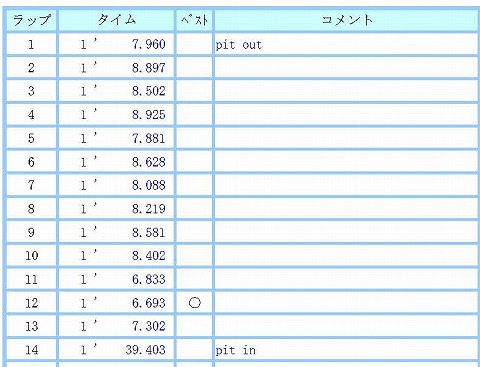 15:37 〜 15:53 午後の走行 2本目 午前、午後で3本走って、最後の走行になります。 タイヤも減ってきているんで、そこそこに、まとめの走行になります。 3時半を過ぎたら、もう誰も走ってないのね。 ちょっと寂しい。(笑) 流石に最後はちょっと疲れて、ペースが上がりません。 何だかんだ言っても、体力が無いとタイムは上がらない。 別に力づくで乗っている訳じゃないんだけど、疲れてくると体勢を安定しにくくなります。 今流に言うと、体幹がぶれるって言うのかな。 とくにブレーキングで。 で、最後ちょっとガンバって、12周目に午後のベスト6秒6。 終了時間の4時まで時間いっぱい走ろうかと思ったけど、お疲れでブレーキングでミスしちゃいそうなので、ちょっと早めにピットに入って、今日の走行は終わりにします。 |