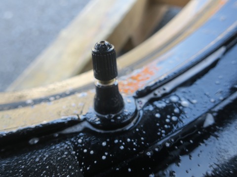 15:19 エア漏れの確認 新しいタイヤを取り付けました。 エアーを入れて、ビートを上げたところで、バルブ周りに洗剤を薄めた水をスプレー。 エアーの漏れが無いかを確認しておきます。 大丈夫そうです。 (^_^)v |