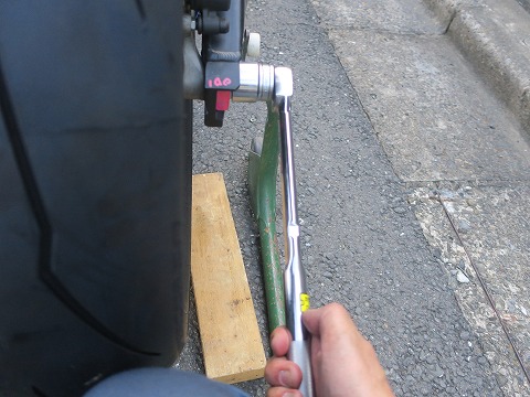 15:35 規定トルクで で、最後にホイルを取り付けて、アクスルシャフトをトルクレンチを使って規定トルクで締め付け。 これで、後輪側は終了。 掃除したり、チェーンを拭いて注油したりしながら作業しているので1時間ほどかかっちゃいました。 |