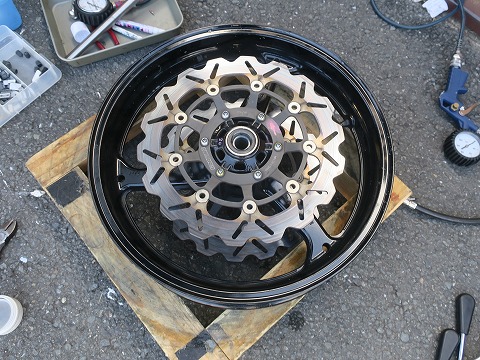 16:34 フロントもおニュー 途中の写真は端折っちゃいました。 バランス取って、フロントタイヤの取付け終了。 あとは、ブレーキキャリパーをエアーで吹いて、軽くダストを落として組んじゃいます。 |