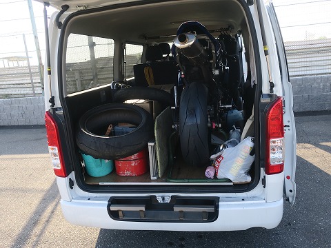 6:24 バイクを降ろす 1本目の走行まで3時間くらいあるけど、バイクを降ろして準備をします。 先週交換した古タイヤも積んできました。 練習が終わったら、タイヤサービスに引き取ってもらいます。 (有料です) こうして見ると、荷物を積んできた。と言うより、投げ入れてきた感、満載です。 |