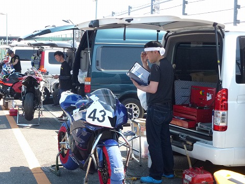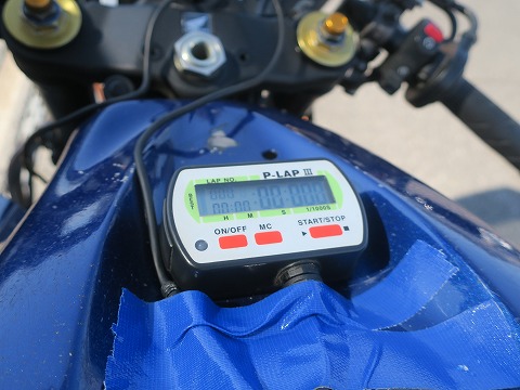 8:09 走行時間より ブリーフィングを終えてパドックに戻ったら、走行の準備を続けます。 タイム計測に使うソフトを入れ替えたGPSレコーダーと、これもソフトを再インストールしたスマホを取付けます。 走行時間より、整備している時間の方がよっぽど多いです。(笑) |