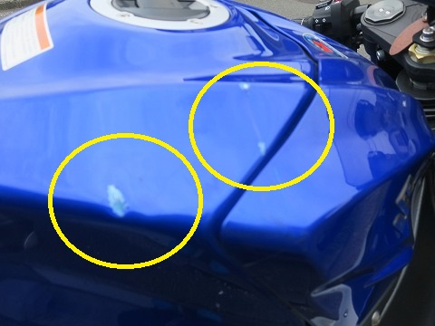 14:22 やっちまったよー。 (ToT) タイヤ交換をしようと、レーシングスタンドを立てようと思ったら、バイクがツツツーっと動いてグラリ。 ガシャン! (゚Д゚) 転かして、しまいました。 (ToT) 自宅の前の道は、結構な坂になっているんですよ。 レーシングスタンドを立てるとき、一気にスタンドで上げないと、バイクが坂を下っていてしまうんです。 でも、一気にスタンドをかけようとして、フックに両方とも上手くかかってないと、これまた片側だけ浮いて倒れてしまう。 今回は、かけるタイミングが遅くて、バイクが下り坂に向かって動いてしまい、支えることが出来ずに、立ち転けさせてしまいました。 「あーあっ。 タンクにキズが・・・・・。」 これで、10万円は価値が下がったな。 (-_-T) |