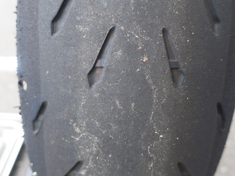 14:22 リヤタイヤは 気分が落ち込んで部屋にこもりたいところですが、作業続けます。 (-_-;) 使用中のリヤタイヤ。 しっかりとスリップマークが出てます。 |