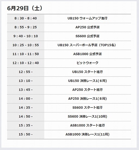 11:50 ASB1000の予選終了 40分間にわたるASB1000の予選が終わりました。 今回初めてASB1000の予選が鈴鹿サーキットで行われたわけですが、トップタイムは2分10秒を切ってきて、2分9秒7。 JSB1000のトップタイムは2分3秒までタイム上がってきていますが、ほぼノーマルのASB1000で、9秒台に入ってくることは驚異的だと思います。 予選の結果、トップの107%以内のタイムに入れなかった1台を除き15台が予選を通過しました。 日本勢では、6番手に中富選手、9番手に伊藤勇輝選手、11番手、12番手に寺本選手、津田選手が並びました。 これで午前中行われた予選はすべて終了です。 午後からのレースに備えて、ちょこっとお昼ご飯を食べに行ってきます。 (つづく) |
