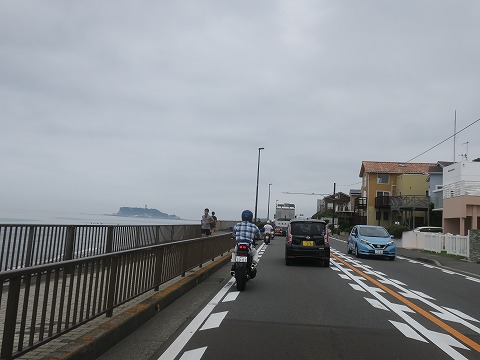 9:49 大曇天 国道134号線を西走して、逗子から鎌倉へ。 稲村ヶ崎を越えると、正面に江ノ島が見えてきます。 天気が良ければバックに富士山が見えます。 けど、今日は大曇天、手前の箱根、伊豆も見えません。 |