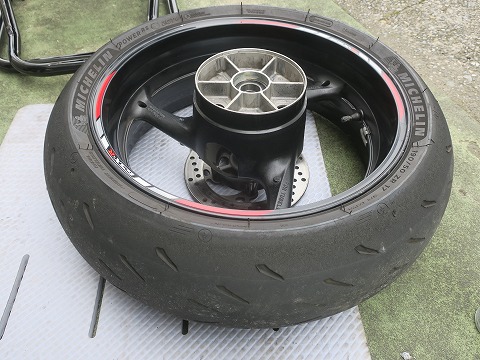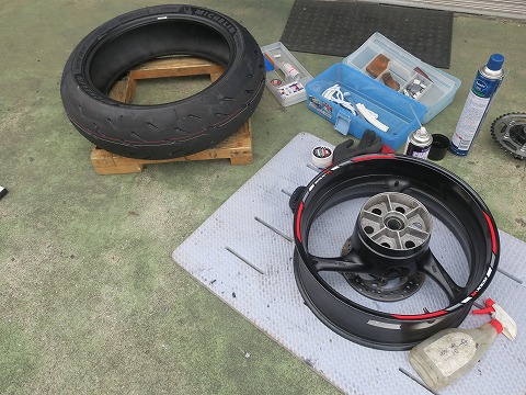 16:22 リヤ終了 バランスを取ったら、リヤタイヤを取り付けて。 チェーンの張り具合を確認、チェーンルブを塗って終了です。 写真の撮影時間を見ると、やっぱり交換作業をしている時間よりも、掃除している時間の方が長そうです。 |