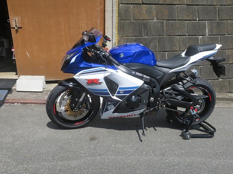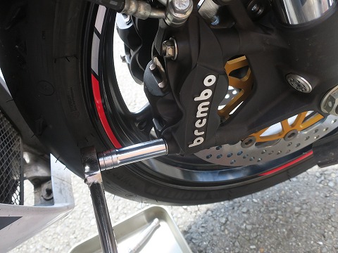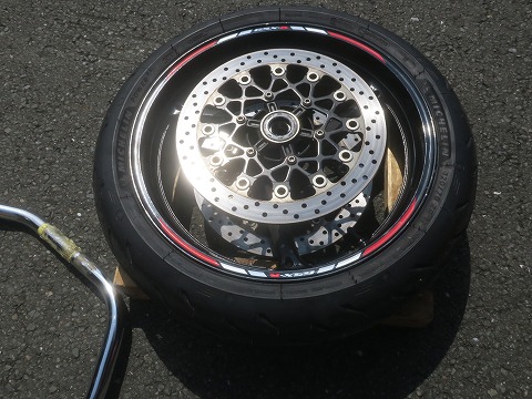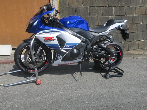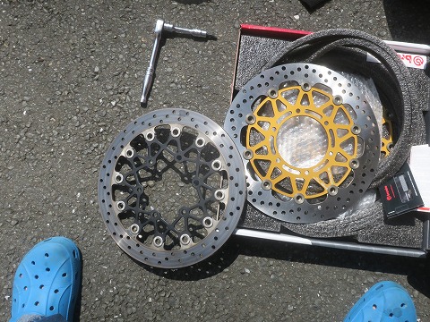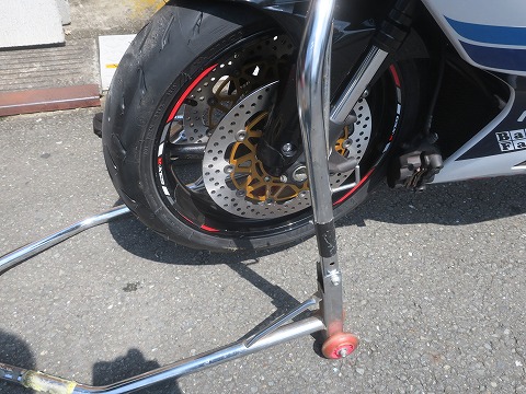 9:20 交換する ディスクプレートはK2Yに頼んでおいて入荷・受取済。 この週末は土曜日も仕事だったので、日曜日の午前中に交換しちゃいます。 この後、家の食材とかを週一の買い出しをスーパーにいかなきゃならないので、あまり時間がありません。 ガレージから引っ張り出して、前後にレーシング スタンドをかけます。 |