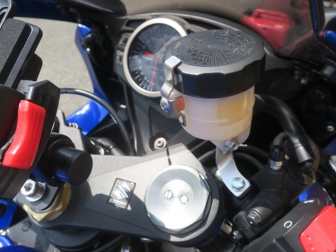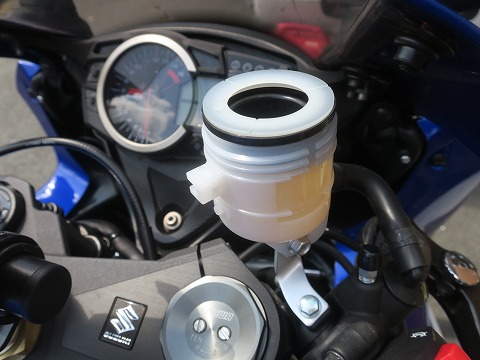 10:07 フルードが 「おっと!忘れてました。」 交換したbrembo のディスク厚は5.5mm、ノーマルが5mmなので、ブレーキのピストンを余分に押し戻さないといけない。 ので、ブレーキフルードもうっかりしてると、リザーバ タンクからあふれちゃいます。 ノーマルのパッドもほぼほぼ新品なので、危なくフルードがあふれるところでしたね。 キャリパーを1個取り付けた時点で気付いて、リザーバを開けたら、フルードがあふれる直前でした。(滝汗) キャップを開けて、ちょっとティッシュを使って吸い込んでおきます。 |