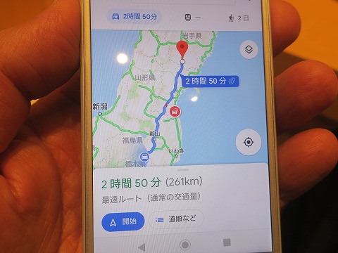 次の給油ポイントは 前回までは雨が降ったのでスタート時刻が遅くなり、高速を使って予定のコースをショートカットしました。 今回は、雨もなく予定時間に出発したので、計画しているコースを走ります。 考えているのは宮城県を過ぎて岩手県に入った最初のインター、一ノ関ICで下りて下道を走る計画です。 出発前に、スマホを使って一ノ関インターまでの距離を確認。 距離261kmと言うことで、途中給油なしで行けますね。 それでは、次は一ノ関インター目指して出発するなり。 |