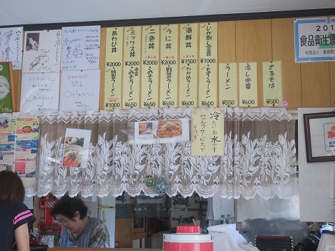10:12 うに丼を注文 店に入り カウンター越しに、おばちゃんに。 『うに丼できますか?』 おばちゃん 『できるよ。 でも、ちょっと時間かかるよ。』 ちょっと前に店を開けて、まだ準備をしている様です。 営業は10時からだったみたいですね。 (通年10時開店ではないと思うので、要確認です) じぶん 『12時20分大間発のフェリーに乗りたいんだけど~。』 おばちゃん 『それなら大丈夫だよ。』 じぶん 『じゃあ、うに丼お願いします。』 |