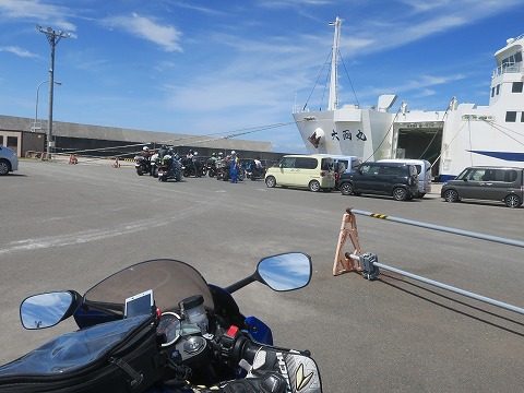 11:22 フェリー埠頭に到着 11時半の乗船開始時間ちょっと前に無事大間のフェリー埠頭に到着しました。 乗船口には、もうバイクが並んでいます。 「この船に乗船されるようでしたら、急いで乗船券を発券してきて下さい。」 と係の人にせかされます。 (^_^;) |