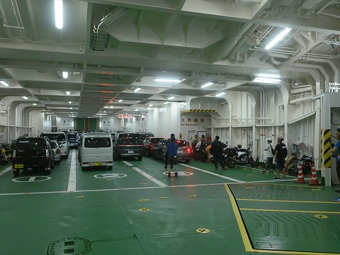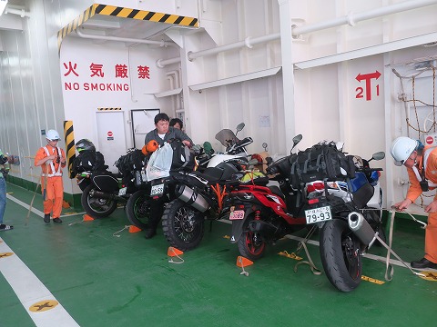 11:30 乗船完了 無事、乗船。 スタッフの人が、バイクを固定していきます。 今ならまだ、下船が間に合うか? 往生際がわるいぞ。(笑) 追)お願いだから、タイヤ止めは忘れないでね。 |