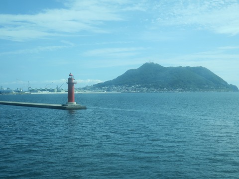 13:14 函館山が 大間を出港すること小一時間、右手前方にくっきりと函館山が見えてきました。 フェリーは左手にグルッと回って、函館湾に入っていきます。 |