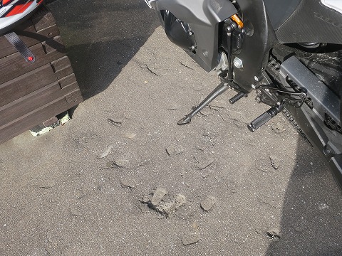 16:15 危険な印 サイドスタンドをかけると、アスファルトの舗装面には無数の”危険な印”。 暑さで柔らかくなったアスファルトにサイドスタンドがめり込んだ跡が多数。 ちょっと危なそうだ。 けど、今日くらいの暑さだと、アスファルトもまだそれほど柔らかくなっていないので、大丈夫でしょう。 GSX-R は軽いし。 (^_^;) |
