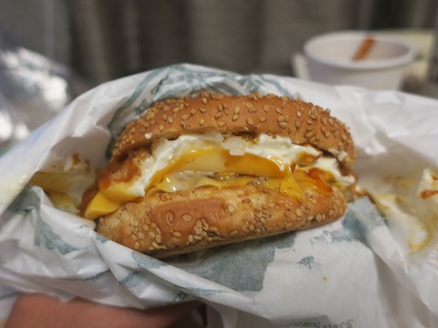19:09 ラッキー チーズ バーガー 続いて、ラッキー チーズ バーガー。 これもデカい。 それ以上に重い、ズッシリくるね。 水に入れたらきっと沈む重量感。 水に沈むバーガーって、どうよ。(笑) パティとチーズと何かのソースかな。 絡み合って特濃状態です。 ジャンクフードマニアには、こたえられない食べ物だね。 ビールにも合うし。 チャイニーズ チキン バーガーを食べた後、これはやっと食べられたぐらいだ。 若い頃に出会いたかった。 |