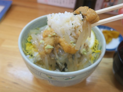 6:43 生うに・いか丼 それでは、さっそく「いただきます。」 ”美味い!”とか、書かない。 不味いわけないんだから。 ウニはこのあっさりとした色合いから、ムラサキウニかな。 イカは歯ごたえがあって、イイですね。 ウニがイカそうめんの肝合えっぽくなって、お互いに旨味を増しています。 「贅沢だなぁ~。」 (^_^)v |