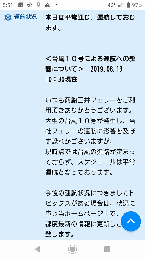 5:51 フェリーの運航状況 ついでにフェリーの運航状況を確認。 昨日の午前10時30分ごろに出されたまま。 基本、1日1回更新みたい。 今のところ、平常運行。 今ここで、”運休します。”なんて書かれたら、パニック起こすね。(笑) |