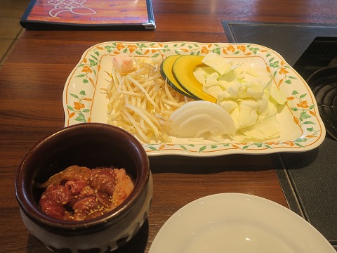 16:35 運ばれてきました。 しばらくして、注文した”漬け込み生ラム ジンギスカン”が運ばれてきました。 生ラムの他に、焼き野菜も付けて。 |