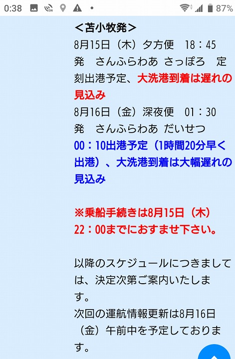 12:38 フェリーの運行状況をチェック カンター越しに注文をして、席に座ったら、フェリーの運航状況をチェック。 大体、毎日11時頃に更新になるんでね。 で、チェックすると、今日15日の夕方便は「大洗港到着は遅れの見込み」 で、16日(金)の深夜便は「1時間20分早く出港・・・・」って、一番大事な自分が予約した16日(金)の夕方便の情報が無いじゃないか! (`Д´) 自分が乗る予定の16日(金)の夕方便は抹殺されたか。 そんなことは無くて、明日の夕方便の情報は、明日の午前中にお知らせする予定らしい。 フェリー会社はまだ迷っているのね。 確かに非常に微妙な状況だからね。 明日の午前中と言うと、今晩根室に泊まって、明日の朝にはフェリー乗り場の苫小牧に向かっている最中です。 苫小牧に向かっている最中に、「今日は欠航です。」 て言われてもねぇ。 路頭に迷ってしまいます。 欠航になっても、野宿にならないよう、苫小牧でホテルの予約をしないとね。 台風が接近している最中に野宿なんて最低ですから。 で、予約したのはルートインの苫小牧。 (ルートイン好きだねぇ(笑)) |