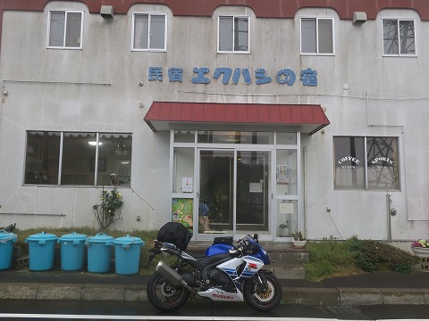 16:20 別館に 別館に移動。 軒下にバイク1台だけ駐められるスペースがあって、そこに駐めさせてもらいました。 ここなら雨に濡れずにすみますね。 (って、既に濡れネズミですが・・・。) ところで、宿の名前のエクハシですが、こんな単語聞いたことないです。 アイヌ語か?と思ったら、エクハシは、北方4島の択捉(えとろふ)、国後(くなしり)、歯舞(はぼまい)、色丹(しこたん)の頭の文字を取ったものだそうです。 |