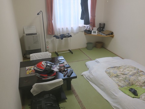 16:35 チェックイン 軒下で雨に濡れたカッパ類を脱いで、荷物のカバーを外したりして、なかなかチェックインできません。(笑) 靴の中までぐちょぐちょなので、靴下まで脱いで、ようやく宿に上がります。 民宿なので、靴を脱いであがるんですがね。 雨に濡れたカッパとか干すところが無いかたずねると、 『遠慮なく部屋にお持ち下さい。』って。 畳の部屋に濡れた衣類やカバンを持ち込むのは、こちらが恐縮してしまいます。 部屋は和室の6畳間。 一人で泊まるにはジャストサイズです。 |