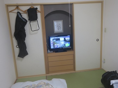 16:35 出入りするときは 民宿なので、風呂は大風呂で、トイレは男女別の共同になっていました。 部屋の入口側は、左側が布団とかの収納スペースで右側は部屋の出入り口です。 なので、部屋を出入りするときは、テレビがお隠れになる構造。 洋服掛けが出入り口の向こう側にあるので、湿気がこもらないよう開けっぱなしにしたいのですが、それだとテレビが見られなくなっちゃうので、ちょっと不便。 テレビ優先。 どうせ、明日も雨だし、乾かなくても問題なし。(笑) |
