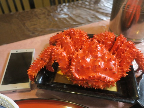 18:33 花咲ガニ ド~ン。 なんと言っても、目玉はこれ。 地元根室特産の花咲ガニ。 漁獲量はそれほど多くなく、首都圏で見かけたことがありません。 明日には帰る(予定)なので、最後の晩は思いっきり贅沢しようと思った次第。 花咲ガニはタラバガニとかと同じヤドカリの仲間だそうだけど、その特徴はこのトゲトゲ。 大きさは平均的にタラバより小さくて、甲羅は12cm×12cmくらいかな。 大きさを比べやすいように、スマホを置いてみた。 一人で独占。 (^□^)v |
