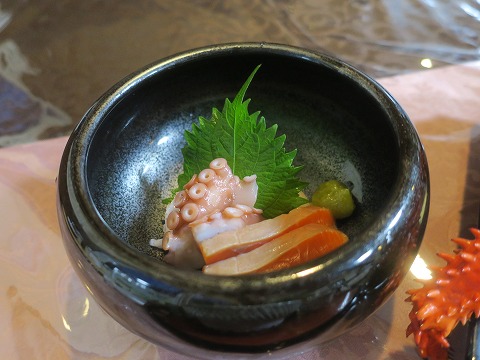 18:36 お刺身 お刺身はタコとサーモン。 これは、後でご飯と一緒に食べましょう。 カニはなかなかご飯のおかずにならないからね。 |