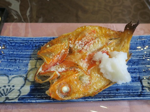 18:41 キンキ 焼きで、キンキ。 これは絶品! 干物(一夜干し)にしたものだと思うけど、凝縮された旨味たっぷり。 見た目 金目と似てるけど、金目はキンメ目、キンキはカサゴ目でまったく別の魚だそうで。 北海道(寒流域)を中心に捕れる超高級魚で、大きいのだとキロ1万円くらいするらしい。 自分が食べたのは、100gちょっとかな。(笑) ノドグロも旨いけど、キンキも負けず劣らず。 |
