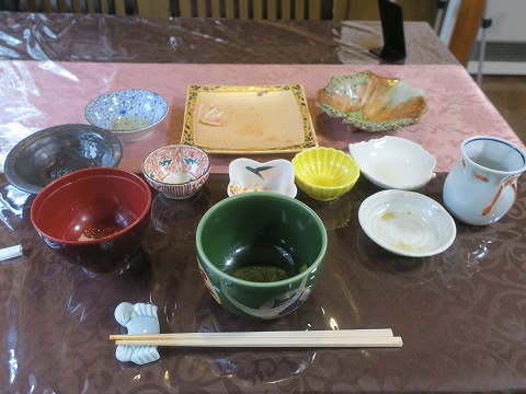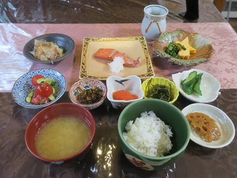 7:50 ごちそうさま 「ごちそうさまでした。」 完食。 まるで、空の器だけ並べた様です。(笑) シャケの焼いたのは、流石に美味かったですね。 |