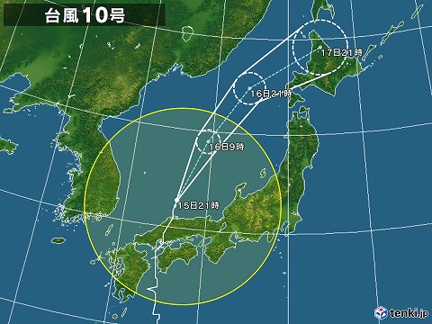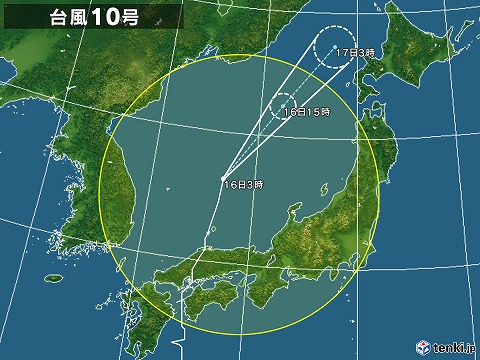 台風チェック 昨晩の天気図を見ながら、好き勝手なことを書きましたが、やっぱり気になるわけで。 まあ、朝のひととき、朝食までの間、特に他にやることがないというのも理由の一つですけどね。 でも、この台風10号の暴風域の、デカいですねぇ~。 今日の夕方には、苫小牧は暴風域に入ってしまいますね。 (ーー;) 運行か欠航か決まるのが、今日の昼頃と言うことなので、とりあえず苫小牧に向かうしかないですね。 |
