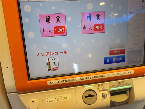 7:30 食券を レストランにやってきました。 朝食は7時半から営業。 入口の券売機で食券を買います。 1,050円、安くはないね。 ブッフェだけど。 朝はもうアルコールは売ってません。 あるのはノンアル。 |