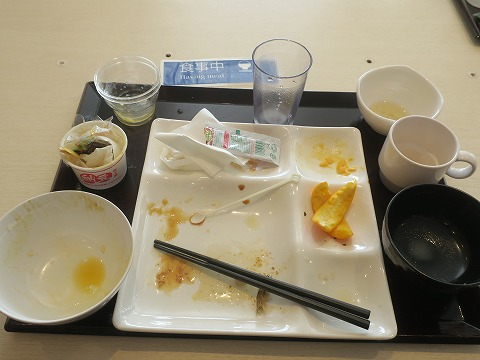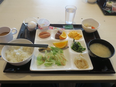 7:46 朝食 ようやく料理を取って、席に着きました。 ブッフェスタイルなんですが、自分的にちょっと控えめ。 昨晩今朝食べるつもりだった分のおおきなおにぎり食べちゃったからね。 左上、ゆで卵だと思って持ってきて、割ったら温泉玉子でした。 ちょっとビックリ。 良くある話だけど。(笑) |