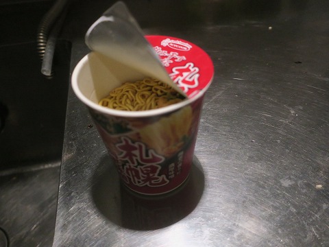 10:53 早めの と言うことで、ちょっと早めのお昼。 決してお腹が空いていた訳ではありません。 お昼は昨日セコマで買い込んだ、北海道限定のカップラーメン。 給湯室でお湯を入れて、いただきます。 |