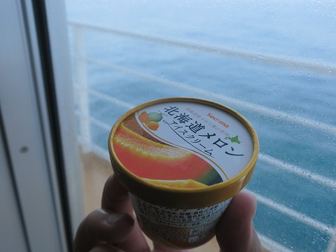 11:07 メロンが お昼にカップラーメンを食べた後、フェリーの売店を散策。 昨日食べた夕張メロンが美味しかったので、”北海道メロン アイスクリーム”。 販売元はセコマだ。 それでは、「いただきます。」 本物の夕張メロンには敵わないけど、美味しい。 ホントに食っちゃ寝、食っちゃ寝だね。(笑) |