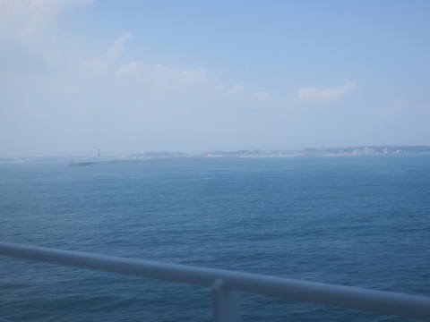 12:45 大洗が 12時半を過ぎて、陸地が近づいてきました。 左前方にピョコッと飛び出て見えるのは、フェリーターミナルに隣接している大洗マリンタワー(高さ60m)。 大洗港はもう少しです。 |