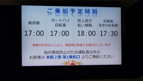 15:30 乗船予定は 発券はすでに始まっていて、バイクの乗船の予定時刻は 17:00 って表示されているけど、16:30 頃からだってアナウンスしてました。 |