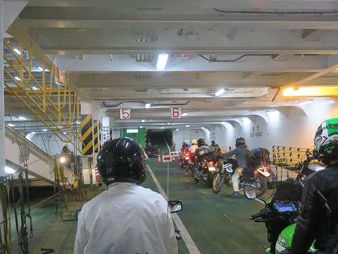 13:45 下船 上の階のクルマ(四輪車)が下船が終わり、バイクの下船が始まりました。 狭い車両甲板で、早々にエンジンをかけちゃうバイクがいて、目が痛いっちゅうの。 はやる気持ちはわかるけど・・・・・。 |