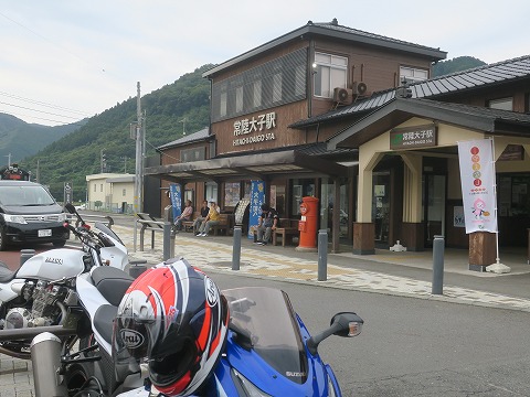 7:52 水郡線(すいぐん せん)の駅 常陸大子(ひたち だいご) ガソリンを入れたら人間にも。 国道118号線で道の駅奥久慈だいごまで来たら、久慈川を渡って国道461号線へ。 ちょこっと走って、水郡線の駅 常陸大子に到着。 朝食食べます。 |