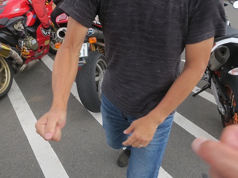 17:37 三郷IC 友部JCTから常磐道に入り南下、三郷ICに到着です。 途中、片側3車線の常磐道を、空いている一番左の第一車線を走っていると、第2車線を走っているBM(バイク)がふらふら〜っとこっちの第1車線へ。 速くないスピードでふらふら〜っと、と意味も無く車線変更。 こっちの車線の方が流れが速いですよ! 「あっ! こいつ後ろ見てない!」 当たったねぇ。 自分のミラーと腕とBMのミラーが。 後ろで見ていたオッシーさんの話だと、BMのミラーが落下したって。 危なかったね。 ブレーキレバーに当たっていたら、その場でジャックナイフして前転だった。 第2車線より、第1車線の方が絶対に流れが遅い。とは限らないからね。 車線変更するときは、後ろも確認しようね。 BMさん。 |