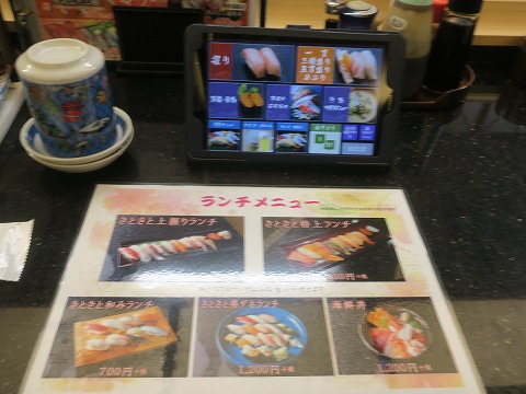12:54 タッチパネルで お一人様だったこともあり、ほとんど待たずにカウンター席にご案内。 注文は目の前にあるタッチパネルでする方式です。 なんて言ったらいいのかわかりませんが、お寿司を運ぶ回転するコンベアは無いので、回転寿司じゃありません。 チェーン店のお寿司屋さんですね。 回転寿司自体あまり行くこともありませんが、最近は回転するコンベアの回転寿司は減ってきているそうで。 その代わり、レーンで注文した品をピストン運搬する方式の店が増えているらしいですね。 よく知らないけど。 いずれにせよ、この手のお店でタッチパネルで注文するのは賛成です。 混んでいると忙しそうに握っている店員さんに注文するの気が引けちゃうんですよね。 小心者だから・・・。 ( ̄。 ̄;) |