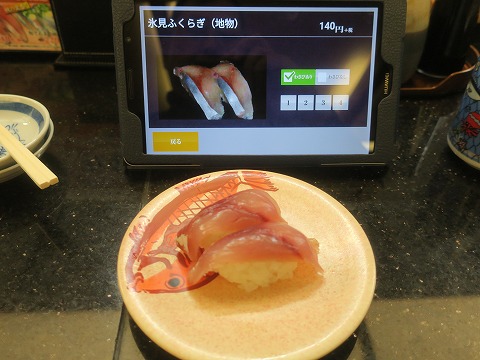 12:58 ふくらぎ 早速、タッチパネルで注文。 タッチパネルの写真とかなり違うけど、多分”ふくらぎ”。 ”ふくらぎ”だったかな? ふくらぎはブリの幼魚、富山での呼び方らしい。 関東だと、ブリの小っちゃいので”いなだ”に当たるのかな。 ワラサだともう少し大きいのを呼ぶみたいです。 けど、食べた限り、よくわかりません。(笑) 脂が乗ってないのでブリじゃないのはわかるんですが、これが育ったらブリになるのは、食べた限り自分は予想できないですね。 やっぱり、真冬に脂がのったブリと比べてはイケない。 |