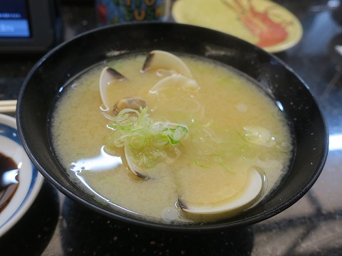 13:00 汁物は ツーリングの途中なので、当然アルコールは飲めない。 なので、汁物でアサリのみそ汁を注文。 普通に美味しい。 |