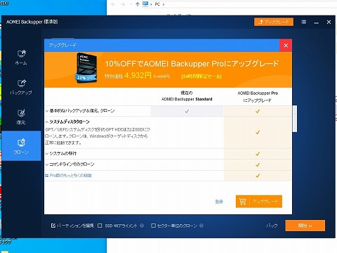 買ってね。(>_<) クローニングをスタートしようとすると、「アップグレード(有料)」 してね。って。 Free(無料)の範囲では、システムクローンをさせてくれません。 色々と設定を変えてみても、(自分の実力じゃ)ダメだ。 |