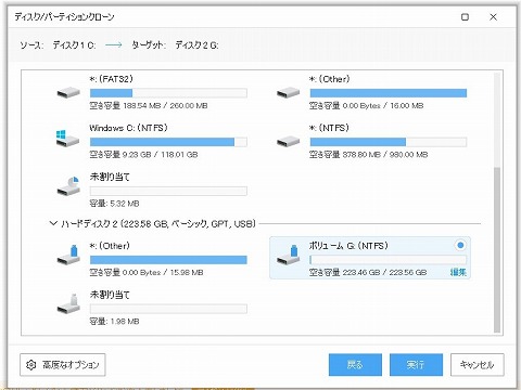 クローニング先のターゲットディスクに新しいSSDのGドライブを選択。 |