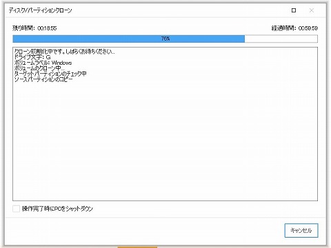 クローン作成中 クローン作成中です。 1時間近くかかって 75% まで進行。 あと20分ほどでクローニングは完了するはず。 |