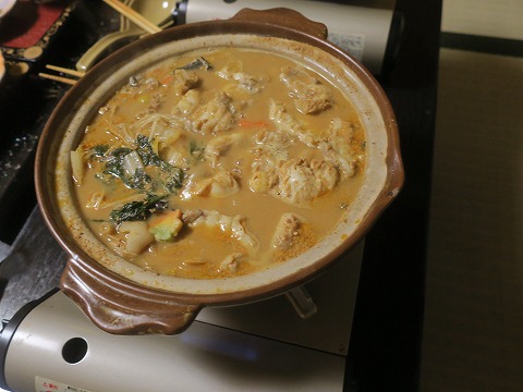 19:09 アンコウ鍋 で、メインのアンコウ鍋。 別名ドブ汁、見た目は悪いです。(笑) 去年はほとんど食べられなかったけど、今年はしっかり食べられる。 かな? アンコウ鍋は、濃厚な味で美味いです。 アン肝とみそ味で仕立てられた鍋のアンコウの身は美味しいですねぇ~。 |
