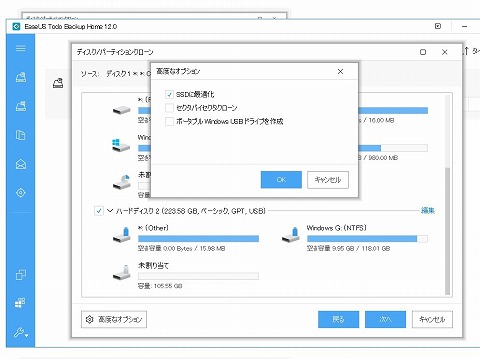 オプション設定では 高度なオプション設定では、”SSDに最適化”にチェックをするらしい。 |