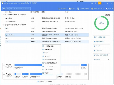 ソフトをインストール 早速ソフトをインストールして起動。 Cドライブを選択して”サイズの調整・移動”を選択。 |